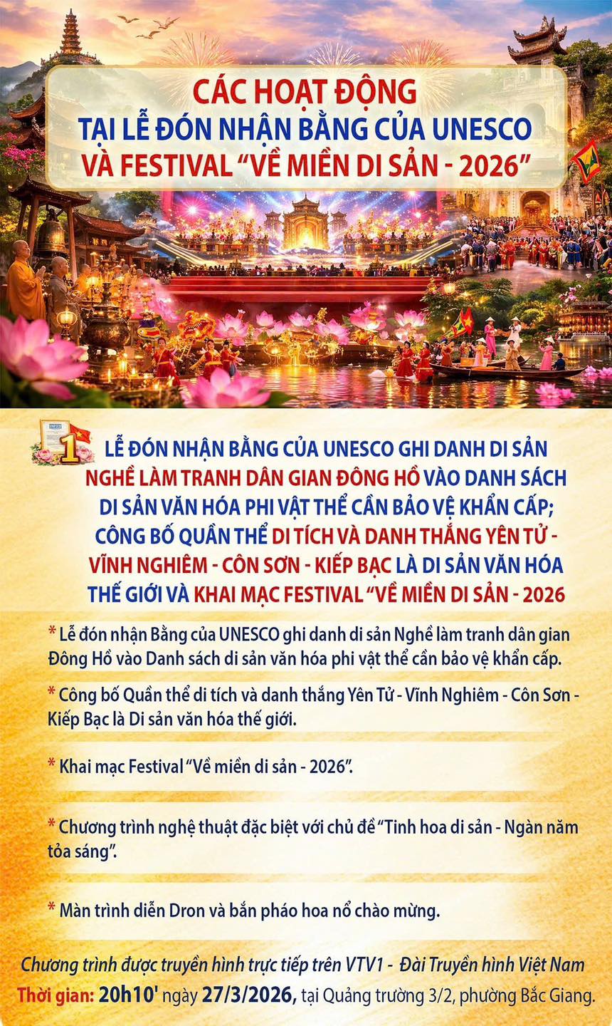 Festival “Về miền di sản - 2026” diễn ra vào lúc 20g10', ngày 27 tháng 3 năm 2026, tại Quảng Trường 3/2, Phường Bắc Giang, tỉnh Bắc Ninh và được truyền hinh trực tiếp trên VTV1 - Đài Truyền Hình Việt Nam.