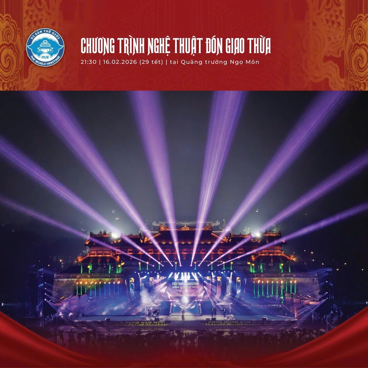 Màn pháo hoa tại Quảng trường Ngọ Môn đêm giao thừa Tết Nguyên Đán Bính Ngọ 2026 - đêm 16 tháng 02 năm 2026 với chương trình nghệ thuật đón Giao thừa của nhiền văn nghệ sĩ tham gia...vào lúc 21g30 ngày 16/02