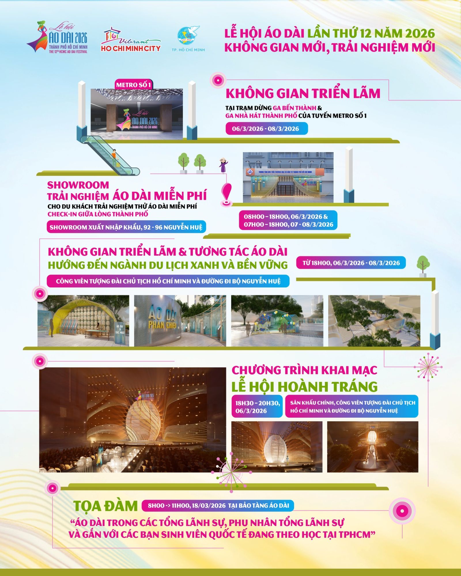 - 15h00: Khai mạc “Con đường áo dài” – không gian triển lãm, tương tác tại Đường đi bộ Nguyễn Huệ.