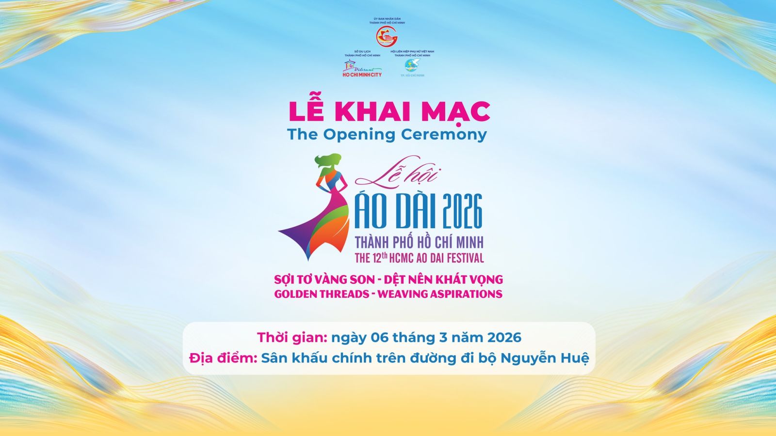 Lễ hội Áo Dài TPHCM 2026 khai mạc vào đêm ngày 06 tháng 3, những cung bậc cảm xúc gói gọn trong 90 phút chương trình sẽ cùng khán giả và du khách đi qua 3 hồi, với nhiều văn nghệ sĩ, người nổi tiếng các lĩnh vực, những biểu tượng nhan sắc và nhà thiết kế hàng đầu như: NSND Bạch Tuyết, Diva Mỹ Linh, Nhóm MTV, Kyo York, Hoa hậu Tiểu Vy, Hoa hậu Lương Thùy Linh, NTK Sĩ Hoàng, Liên Hương, Đỗ Trịnh Hoài Nam, Adrian Anh Tuấn…