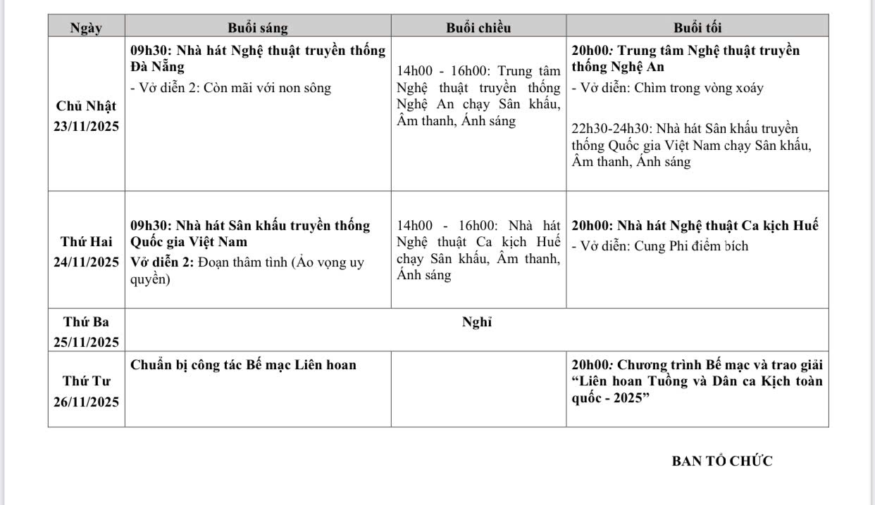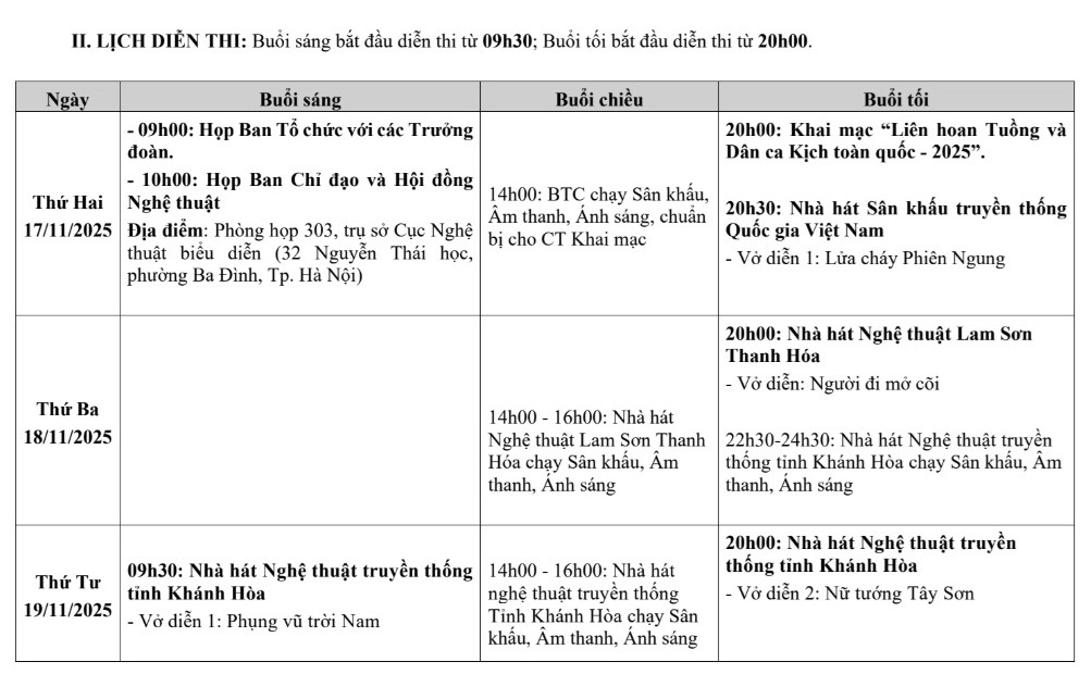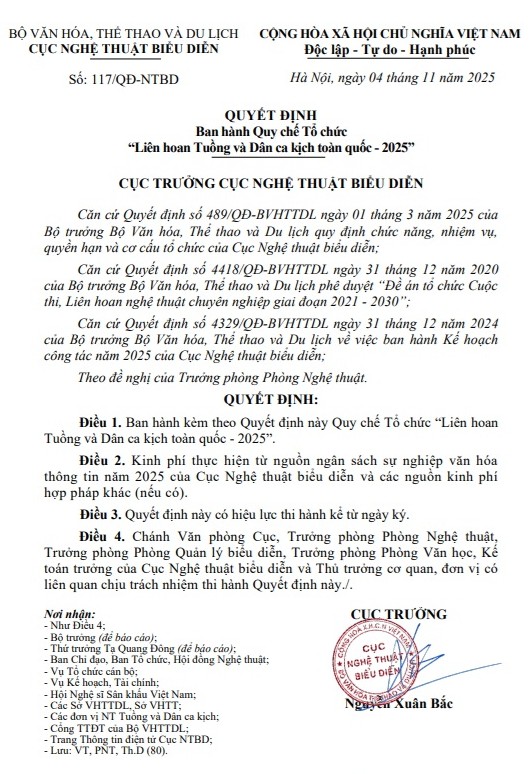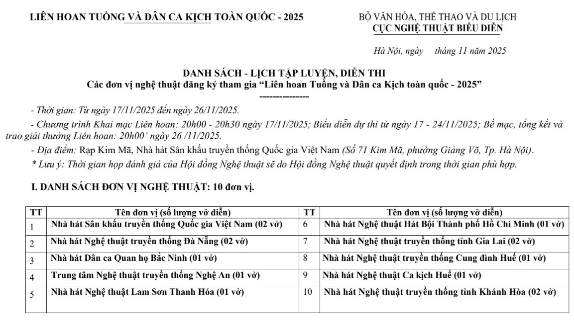 Cụ thể: Cục Nghệ thuật biểu diễn sẽ chủ trì, phối hợp Hội Nghệ sĩ Sân khấu Việt Nam, Sở Văn hóa và Thể thao Tp. Hà Nội, cùng với Nhà hát Sân khấu truyền thống Quốc gia Việt Nam và các cơ quan, đơn vị có liên quan tổ chức "Liên hoan Tuồng và Dân ca kịch toàn quốc năm 2025".