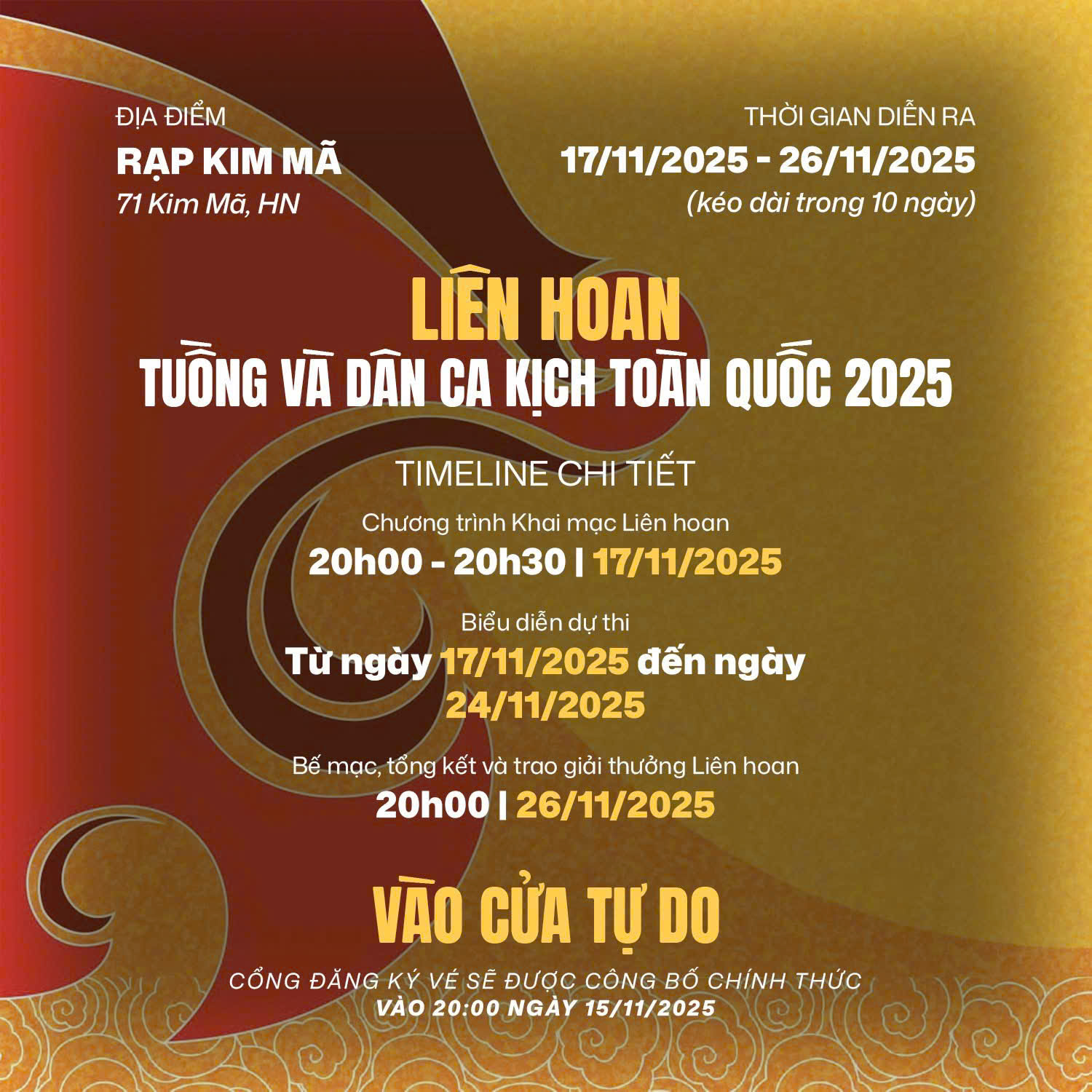 Liên hoan Tuồng và Dân ca kịch toàn quốc năm 2025 sẽ diễn ra tại rạp Kim Mã, địa chỉ số: 71 Kim Mã, phường Giảng Võ, Tp. Hà Nội - Nhà hát Sân khấu truyền thống Quốc gia Việt Nam theo Quyết định của Bộ VHTTDL.