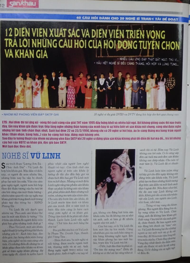 Có lẽ khán giả mộ điệu cải lương sẽ mãi không quên hình ảnh Nghệ sĩ Vũ Linh đăng quang giải thưởng cao nhất của Hội đồng tuyển chọn Giải Trần Hữu Trang hạng mục diễn viên xuất sắc được trang trọng tổ chức tại Nhà hát Hoà Bình năm 1996.