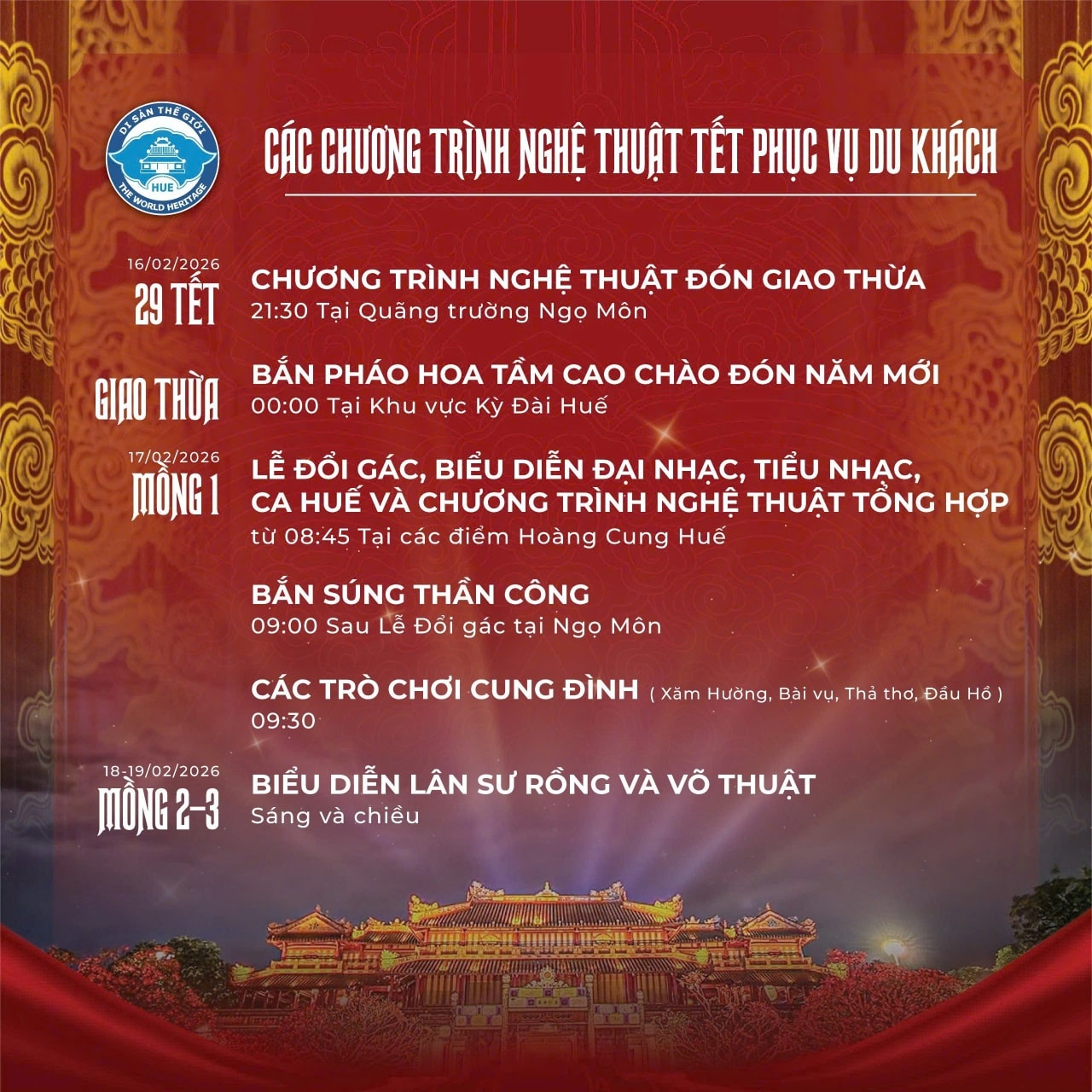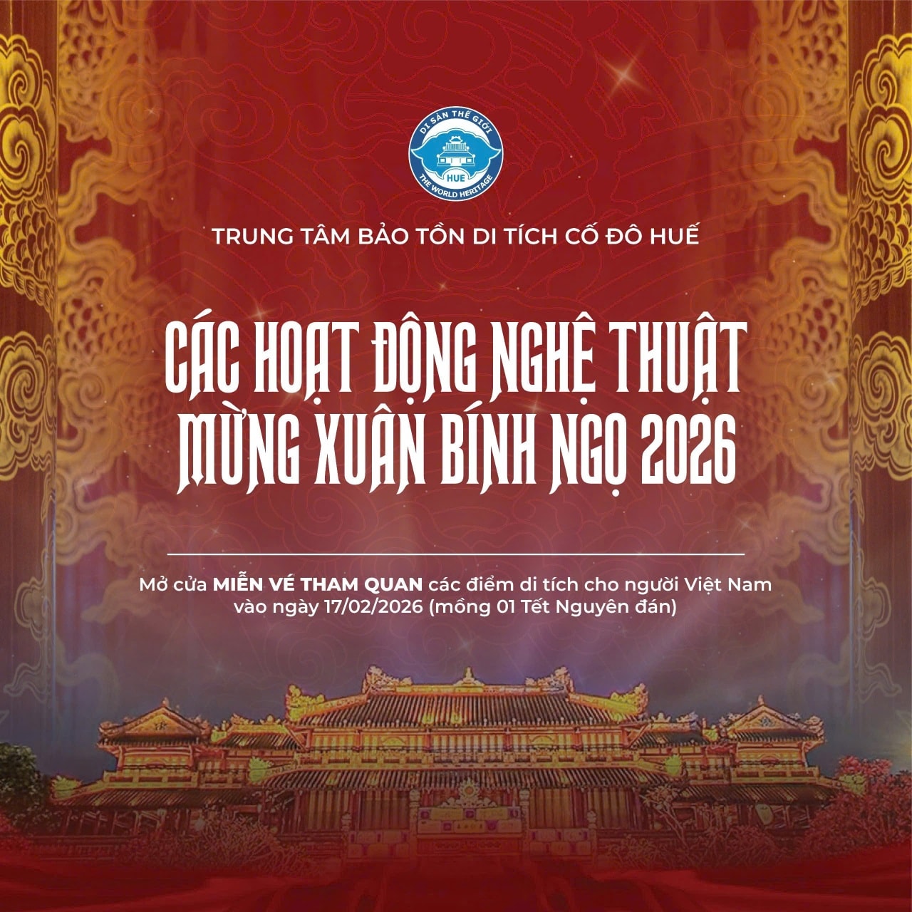 Đặc biệt, Trung tâm Bảo tồn Di tích Cố đô Huế miễn phí vé tham quan các điểm di tích trong ngày 17/02/2026 (Mồng 1 Tết) dành cho người Việt Nam. Du khách quốc tế vẫn áp dụng mức phí tham quan theo quy định, bà con xa gần, du khách trong và ngoài nước đến Huế có thể đến chiêm ngưỡng, thưởng ngoạn và trải nghiệm cùng Tết Hoàng Cung nhé...