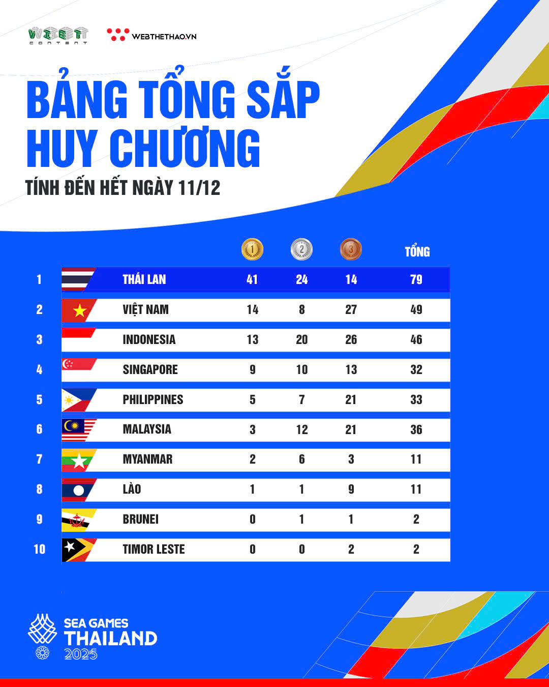 Trong ngày thi đấu 11 tháng 12 năm 2025, đoàn thể thao Việt Nam giành 10 tấm HCV và đã vươn lên vị trí thứ hai trên bảng xếp hạng huy chương tại SEA Games 3