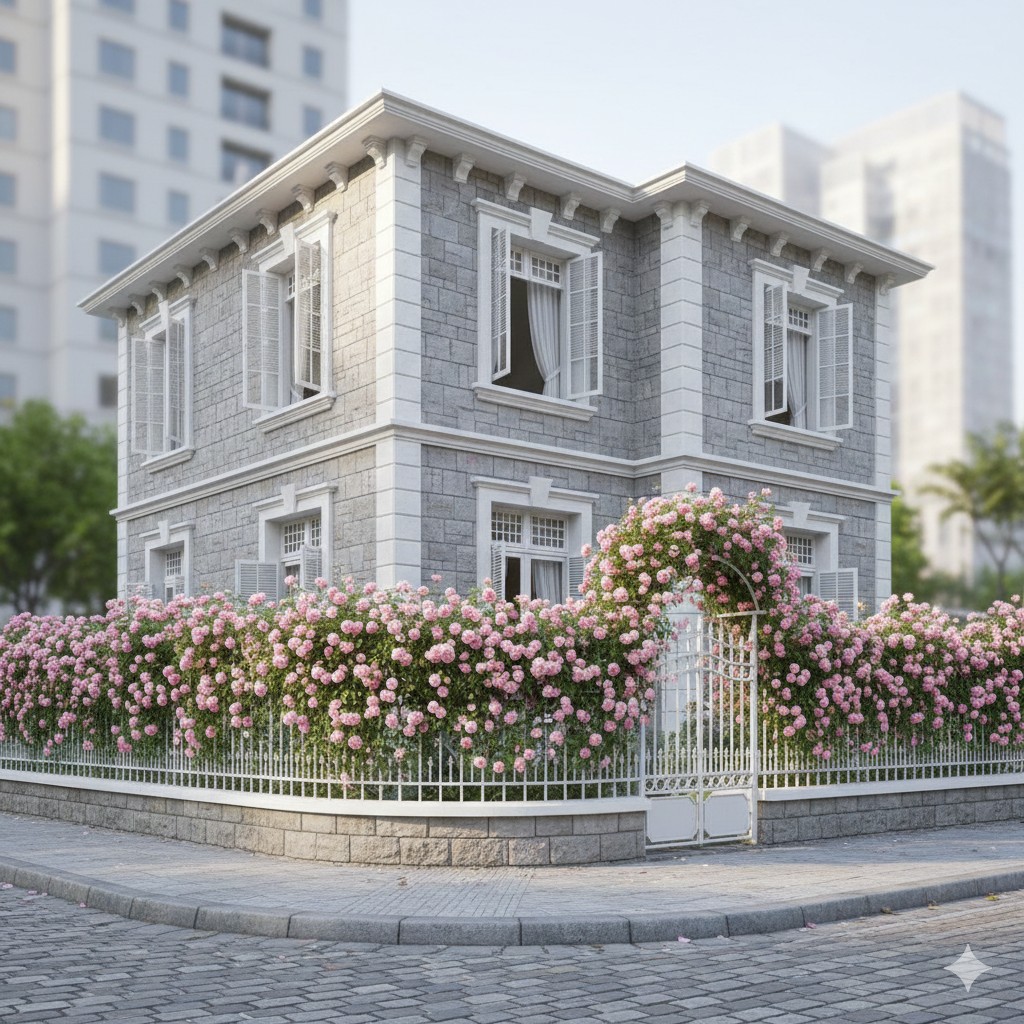 Biệt thự của Nguyễn Nguyễn nằm giữa trung tâm thành phố, mà yên tĩnh đến lạ. Không vườn rộng, không trang trí cầu kỳ. Chỉ có hàng hồng leo màu hồng trồng dọc hàng rào. Nhờ đón được hướng gió, ngôi nhà mát mẻ quanh năm, hiếm khi cần đến máy lạnh. Đến mùa, hoa phủ kín hàng rào bằng sắc hồng dịu dàng – không rực rỡ phô trương, nhưng càng ngắm lâu càng thấy khó rời mắt.