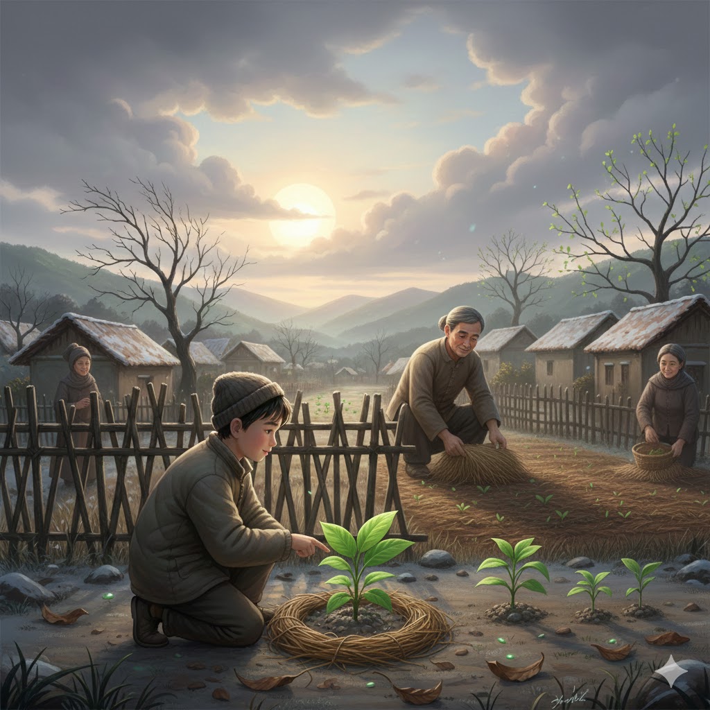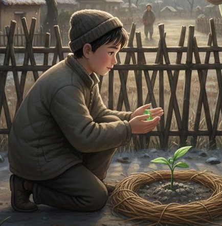 Những ngày sau đó, Bân lặng lẽ làm một việc. Cậu không bới đất, không tưới nhiều nước. Cậu chỉ che gió cho mầm, nhặt những chiếc lá khô phủ quanh gốc, để đất đỡ lạnh. Có hôm sương dày, cậu mang rơm ra chắn.