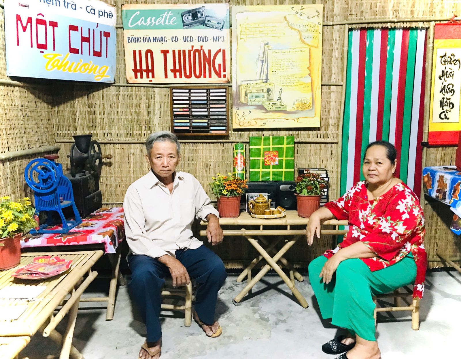 Thoang thoảng mùi hương hoa vạn thọ, xen lẫn làn gió Xuân mát dịu, hỏi thêm về ý tưởng căn nhà tranh được sắp xếp từng bố cục, từng góc kỷ niệm với từng bảng hiệu riêng?
