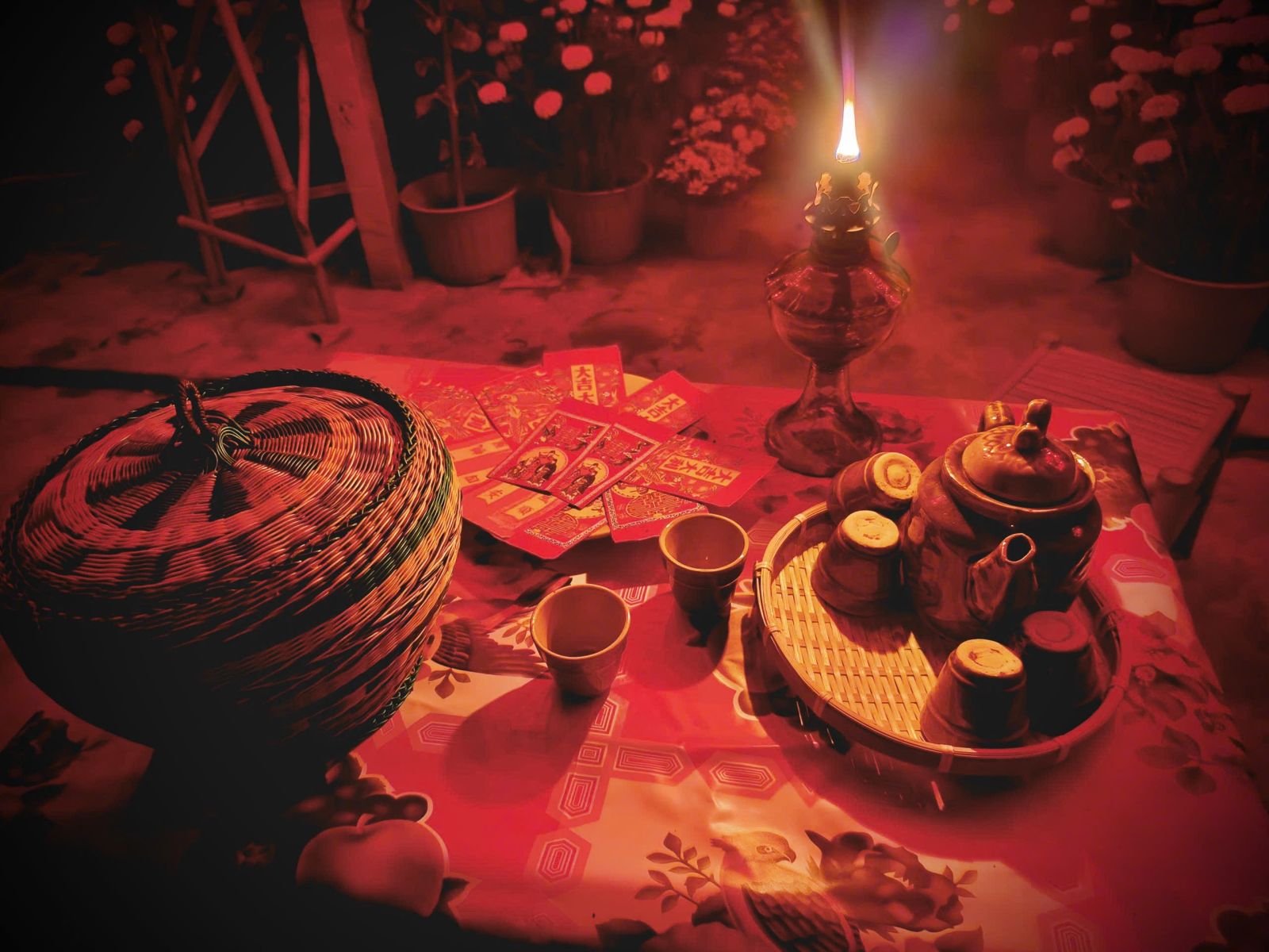 Bên tách trà quen thuộc, mỗi sáng, mỗi tối, bên mái nhà tranh giản dị của người nam bộ, được trang trí những chậu hoa vạn thọ truyền thống của ngày Tết cổ truyền Việt Nam - một loài hoa mang Xuân đến mọi nhà, cây mai trổ vàng, những khóm lúa nhỏ xinh, xen lẫn những chậu cúc đồng, hoa hướng dương... đó là điểm nhấn chính của năm nay thay cho việc trang trí tiểu cảnh mỗi năm.
