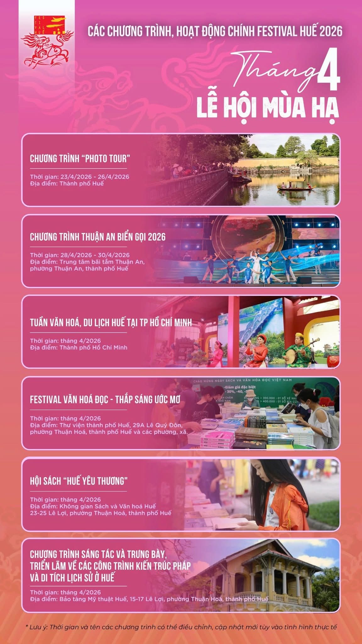 Nếu như các bạn từng mê đắm và vương vấn những hoạt động cũng như lưu luyến Tết Hoàng cung Huế của Mùa Xuân mới thì Huế tháng tư - mùa FESTIVAL 2026 mang tên chủ đề "Kinh Thành tỏa sáng"....