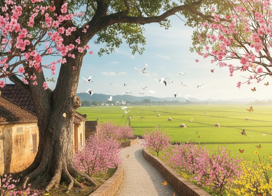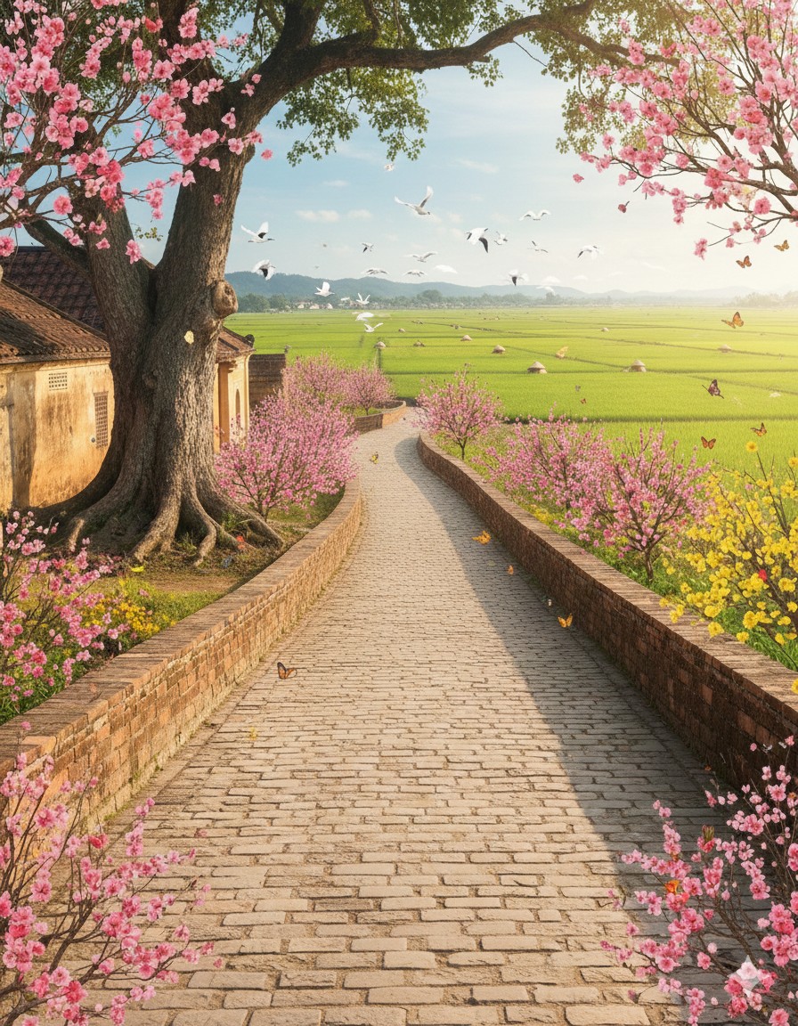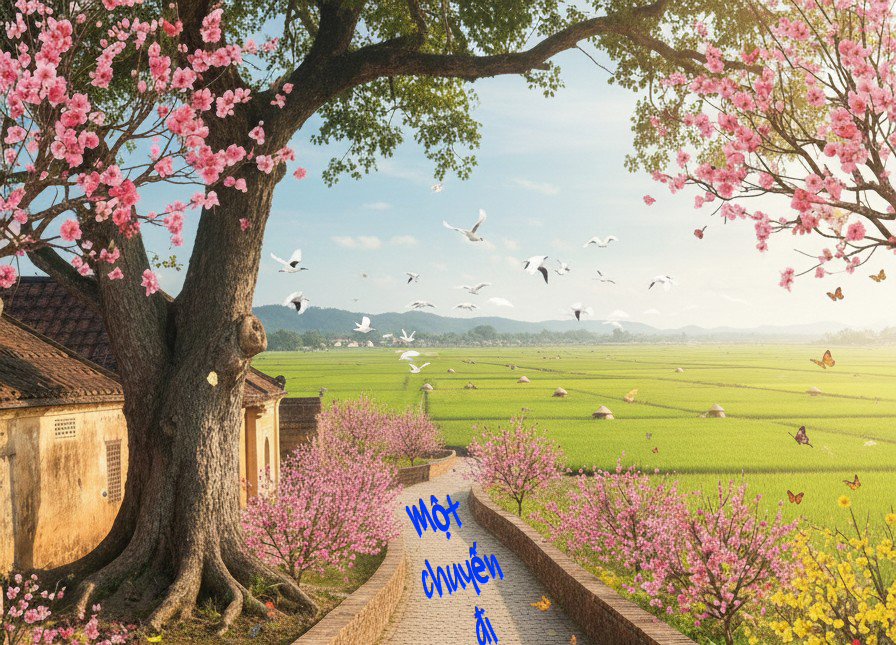Chiều xuống chậm. Ánh nắng nghiêng qua mái đình, chạm vào cành hoa đào hồng phai trên bàn. Anh mỉm cười rất khẽ. Một nụ cười không dành cho ai cả, chỉ dành cho chính mình – cho đứa trẻ ngày xưa, cho người phụ nữ của hiện tại, và cho ngôi làng vẫn kiên nhẫn đợi anh trở về.