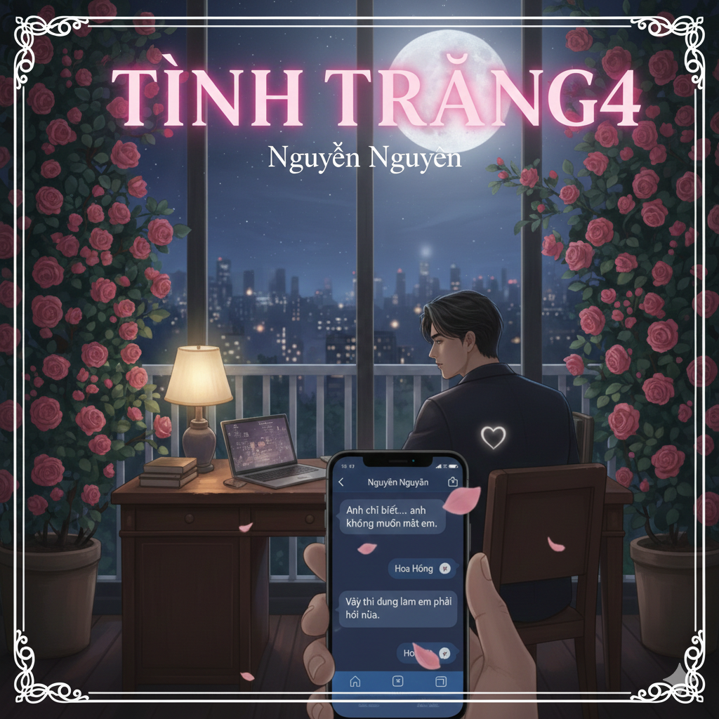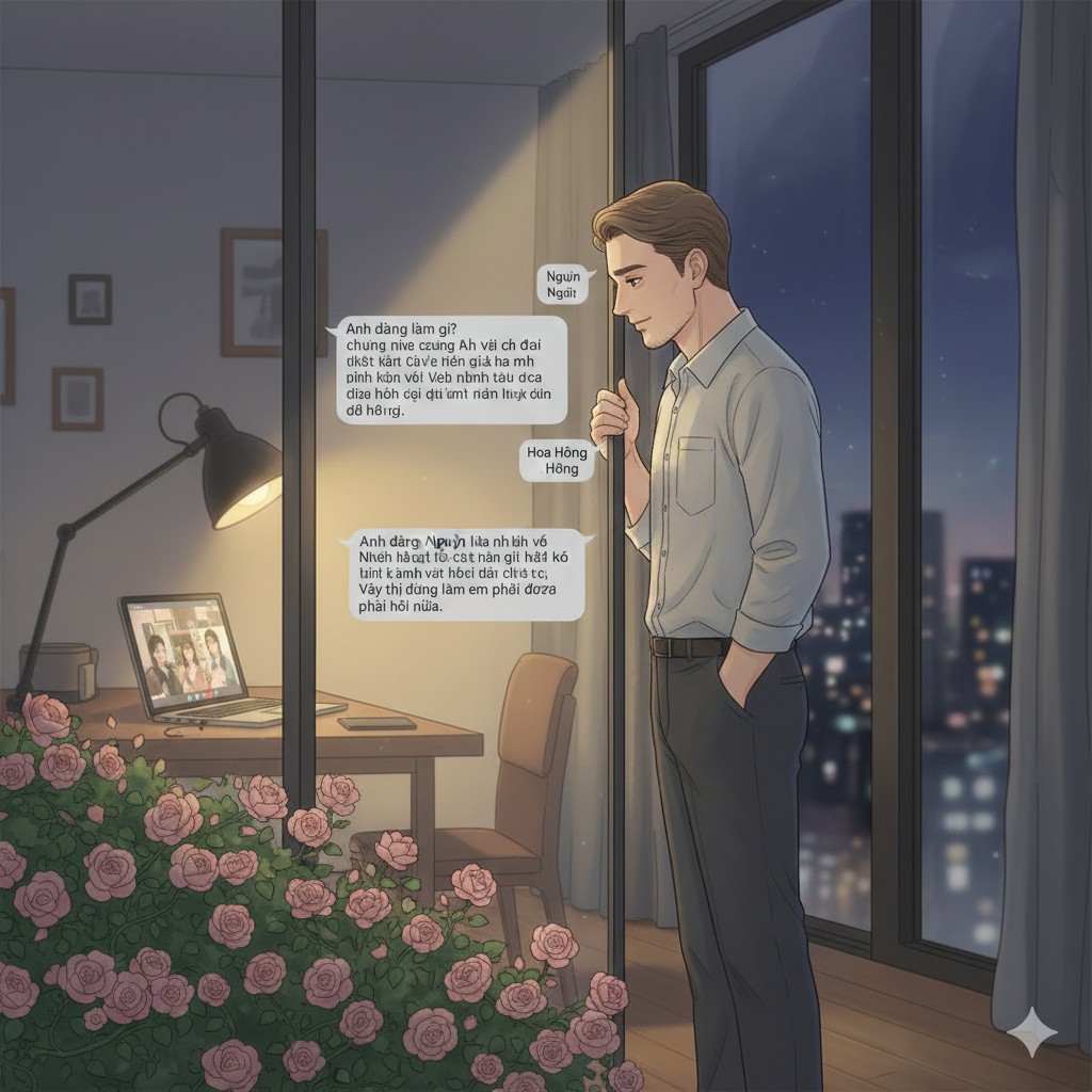 Trong căn phòng làm việc rộng và yên tĩnh, ánh đèn vàng rơi thành một quầng sáng ấm trên mặt bàn gỗ. Ngoài khung cửa kính cao sát trần, giàn hoa hồng leo màu hồng phủ kín hàng rào, cánh mỏng lay trong gió đêm như những nhịp thở nhẹ. Thành phố xa xa vẫn còn ánh đèn, nhưng ở đây chỉ có tiếng đồng hồ tích tắc và tiếng tim ai đó đang cố giữ bình ổn.