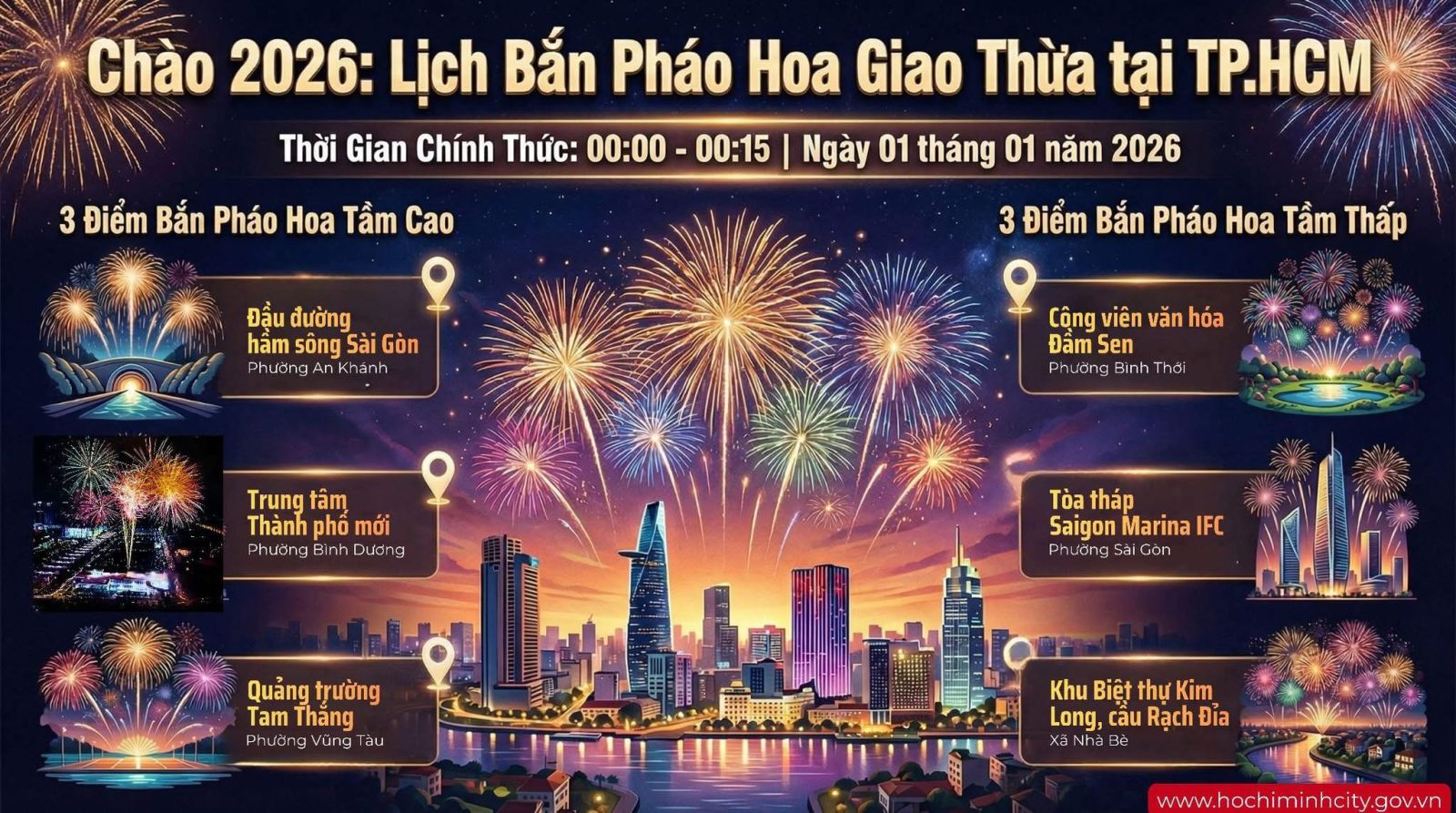 Ngoài ra, 03 trận địa pháo hoa tầm thấp còn lại tại các địa điểm: Phường Bình Thới - Công viên văn hóa Đầm Sen, Phường Sài Gòn - tòa tháp Saigon Marina IFC và xã Nhà bè tại khu biệt thự Kim Long, cầu Rạch Đỉa để phục vụ bà con trong dịp nghỉ Tết Dương Lịch chào đón năm mới Bính Ngọ 2026.