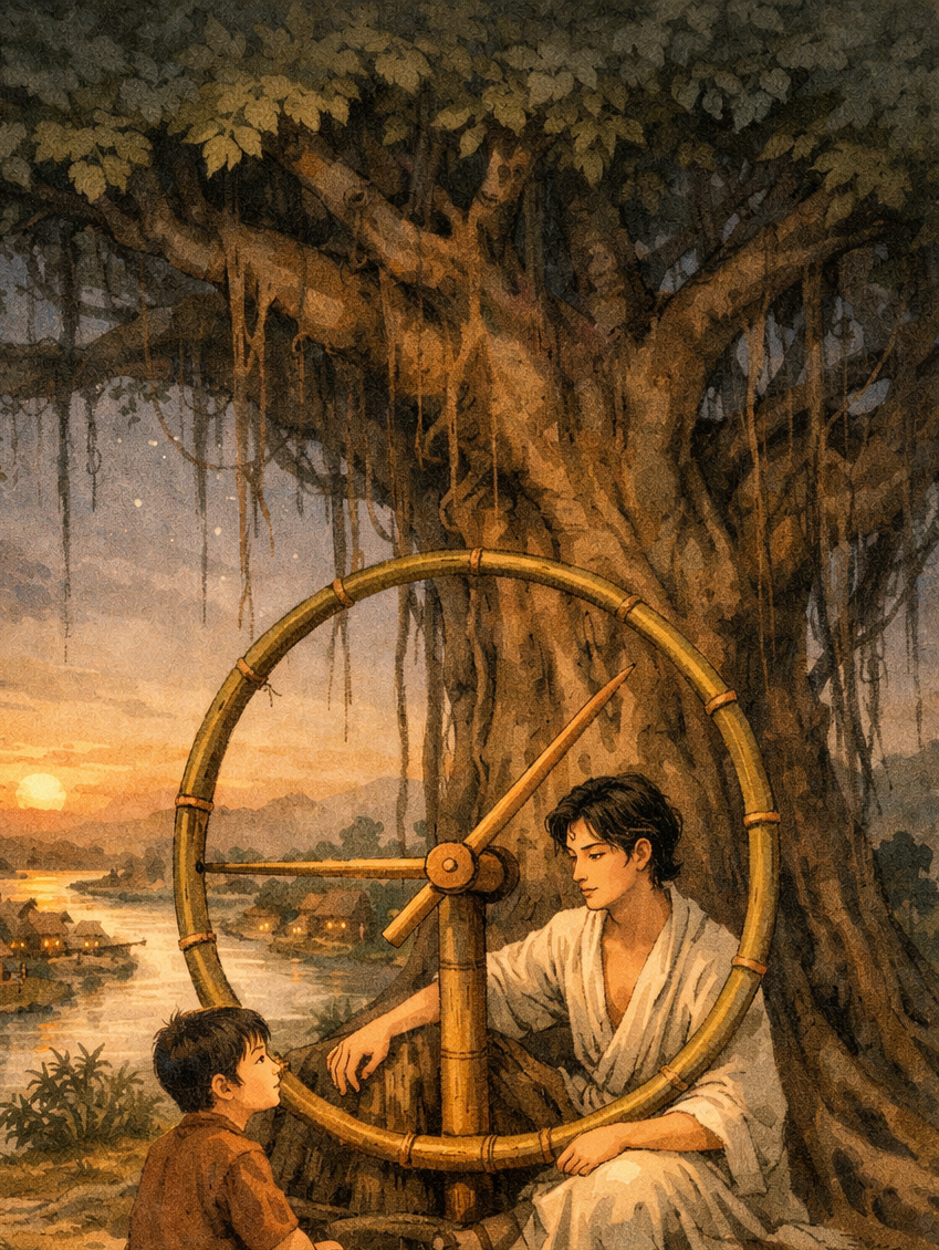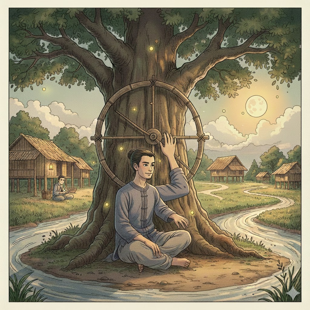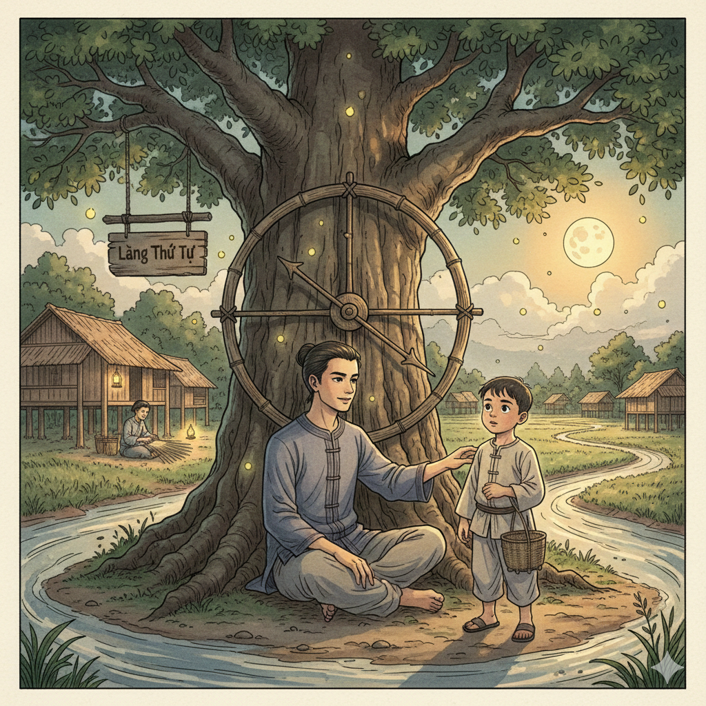 Giữa làng Thứ Tự có một vật lạ: một chiếc đồng hồ làm bằng tre. Không treo trên tường, không đặt trong nhà ai, mà dựng dưới gốc đa đầu làng. Đồng hồ không có kim sắt, chỉ có hai thanh tre mỏng xoay chậm quanh một trục gỗ. Không có số. Không có tiếng tích tắc. Vậy mà người làng nhìn vào vẫn biết sáng hay chiều, biết lúc nào nên về, lúc nào nên đợi.