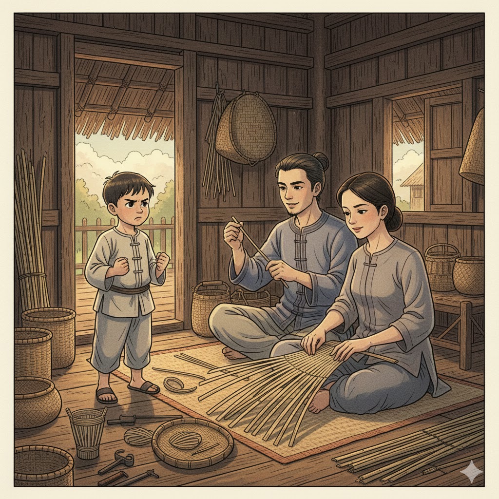Cha mẹ Lựu làm nghề đan tre. Họ quen với việc ngồi hàng giờ, tước từng nan, uốn từng vòng. Lựu nhìn mà bực. “Sao không làm nhanh hơn?” cậu hỏi.