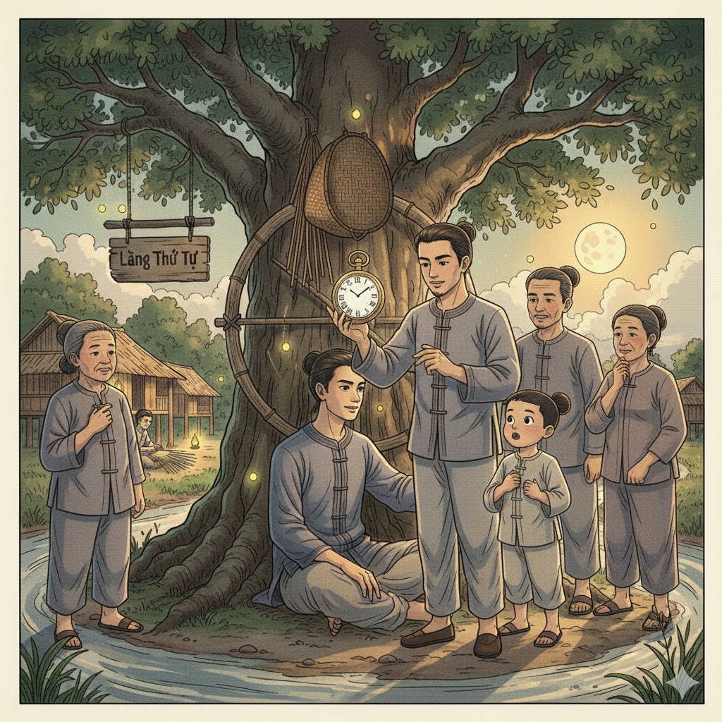 Ngày xưa, ở một vùng quê nằm giữa hai con sông chảy ngược chiều nhau, có một ngôi làng tên là Thứ Tự. Người làng bảo nhau rằng cái tên ấy có từ rất lâu, từ khi ông bà còn chưa biết đếm tuổi, chỉ biết hôm nay nối tiếp hôm qua, mùa này chờ mùa khác. Làng sống chậm. Chậm đến mức người đi xa quay về thường ngạc nhiên: mọi thứ vẫn y như cũ, chỉ có người già hơn và cây cao hơn.