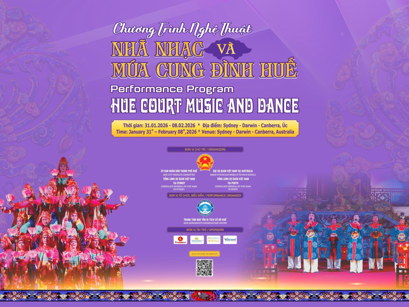 Dịp này, tại 03 thành phố: Sydney, Darwin và Canberra với 04 đêm diển, bạn bè, du khách Quốc tế, đông đảo người dân Australia và kiều bào Việt Nam tại thủ đô Canberra với không gian ấm áp của Tết Việt - Tết Cố Đô Huế - niềm tự hào hòa vào những chương trình biểu diễn nghệ thuật đặt biệt - cũng như giới thiệu đến bạn bè quốc tế về một thành phố di sản của Việt Nam là sự thân thiện, mến khách, hiền hòa và đậm đà giai điệu Nhã Nhạc Cung Đình Huế.